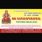 62 Varshamaana Nambikkai! 🌟 Welcome to Sri Samayapurathal Pathira Maaligai in Kumbakonam, located near Potramarai Kulam. We are your trusted source for all Kovil Pooja Porutkal (Temple Needs) and quality household items. Engalidam Kidaikkum: Pure Panchaloha (Iympon) and Brass (Pithalai) Statues, Silver (Velli) Vessels, Copper (Sempu) items, and traditional Kuthu Vilakku (Lamps). We guarantee the best quality for your Seer Varisai (Wedding Gifts) and daily needs. Come shop our legacy of quality and craftsmanship! Best Pathira Kadai in Kumbakonam!